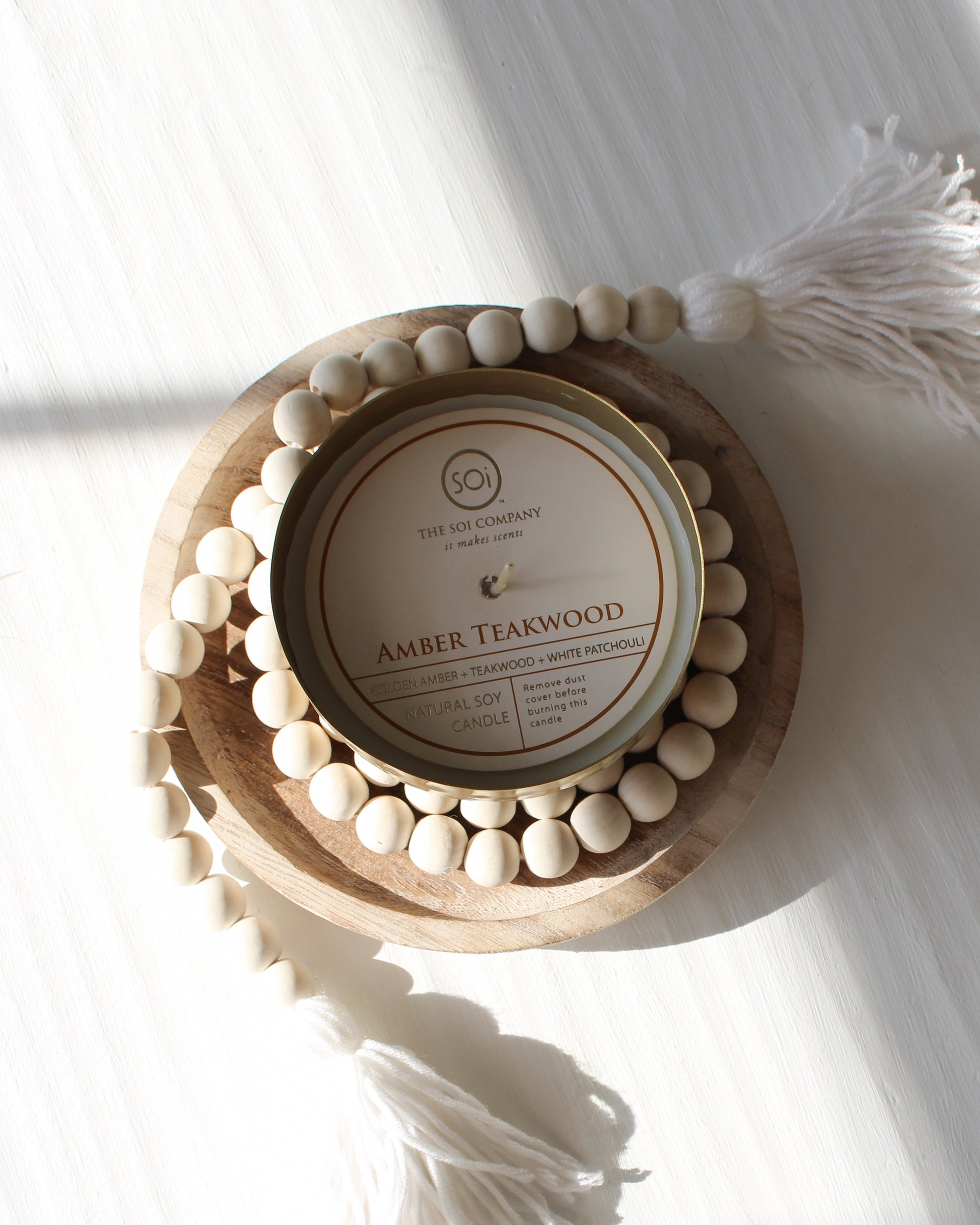 Scent: cozy blend of golden amber and teakwood with subtle hints of white patchouli.