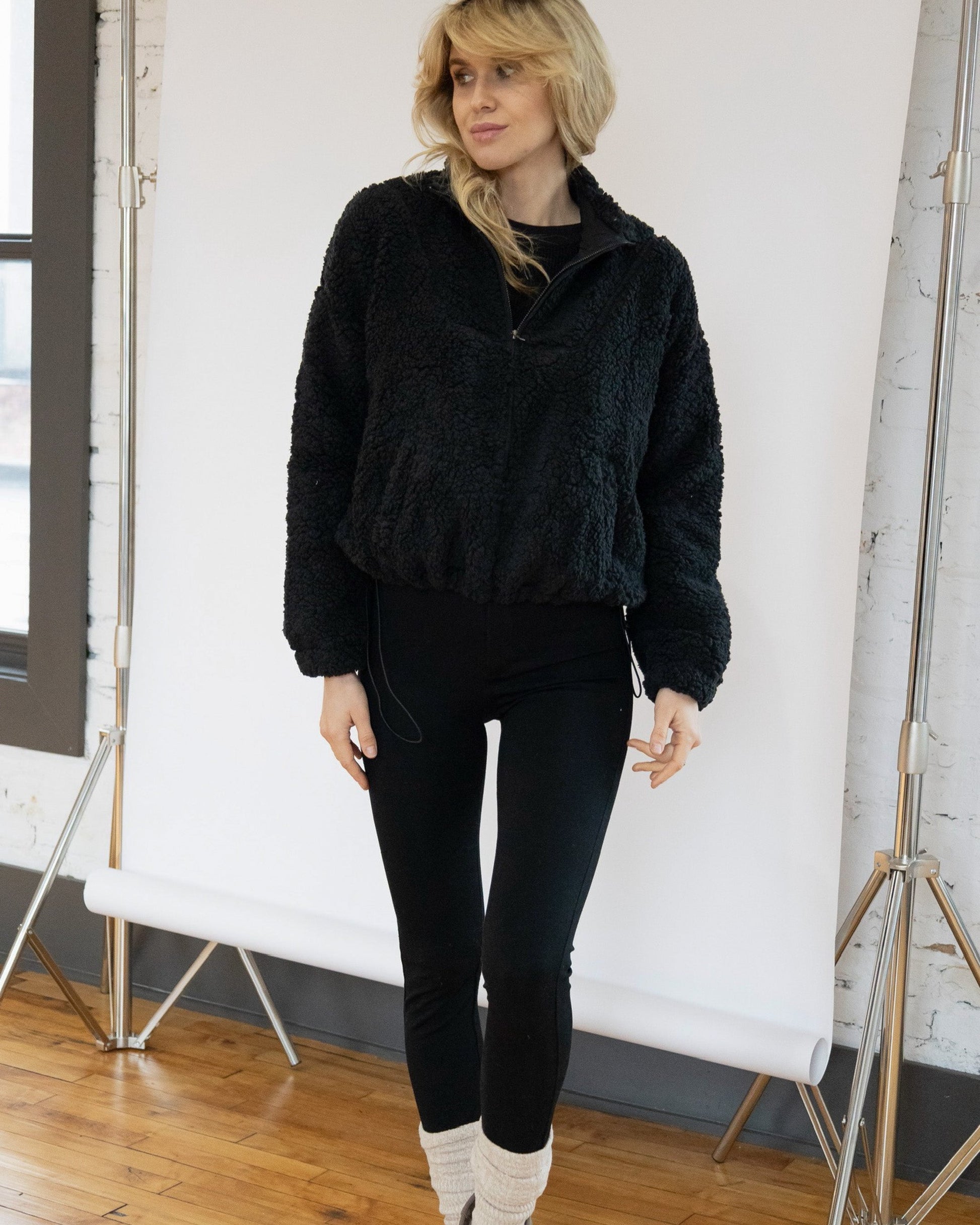 Cuddle up with our sherpa pullover featuring a quarter zip closure, high neckline, and adjustable hemline.