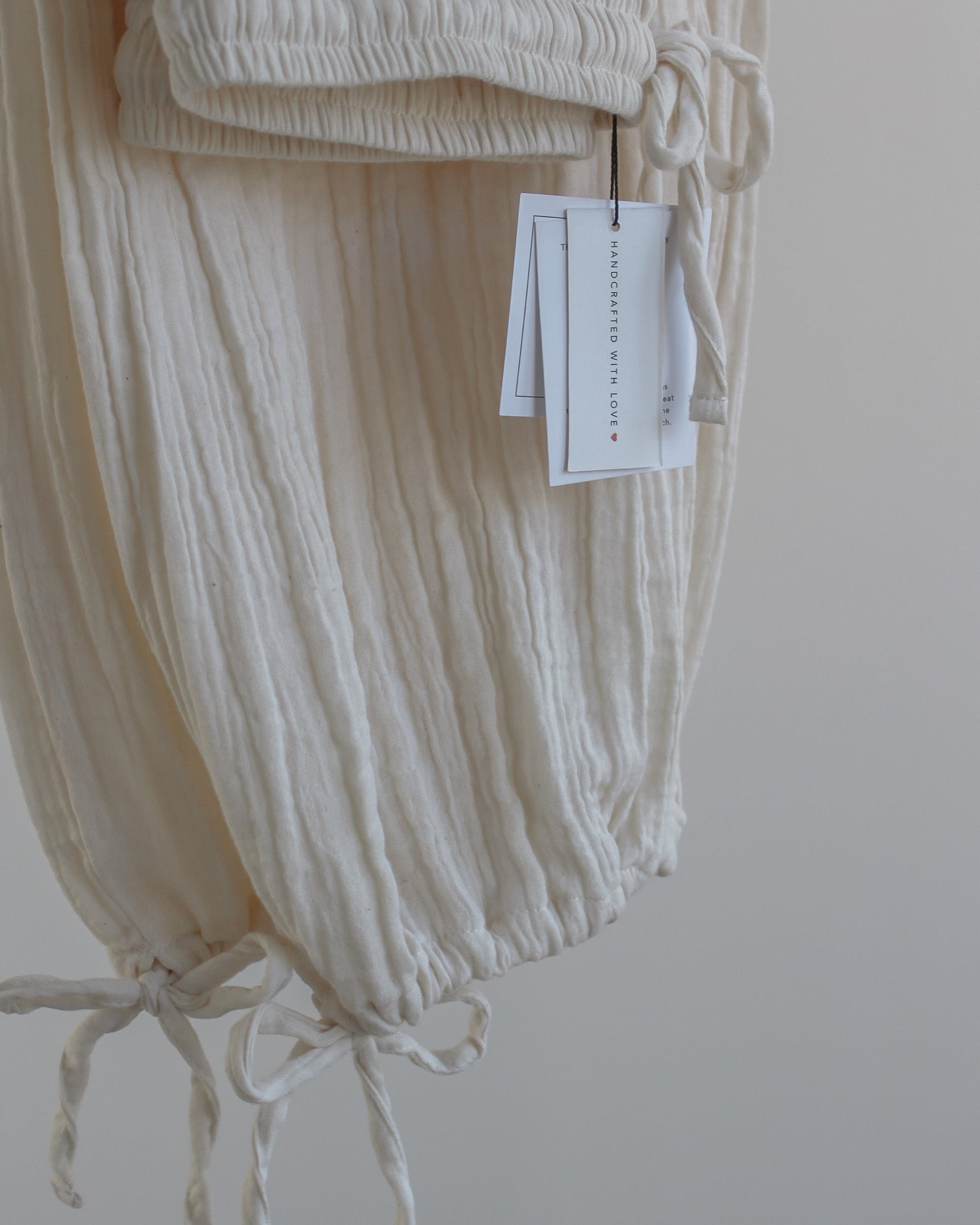 Drawstring waist and adjustable ankle ties.
