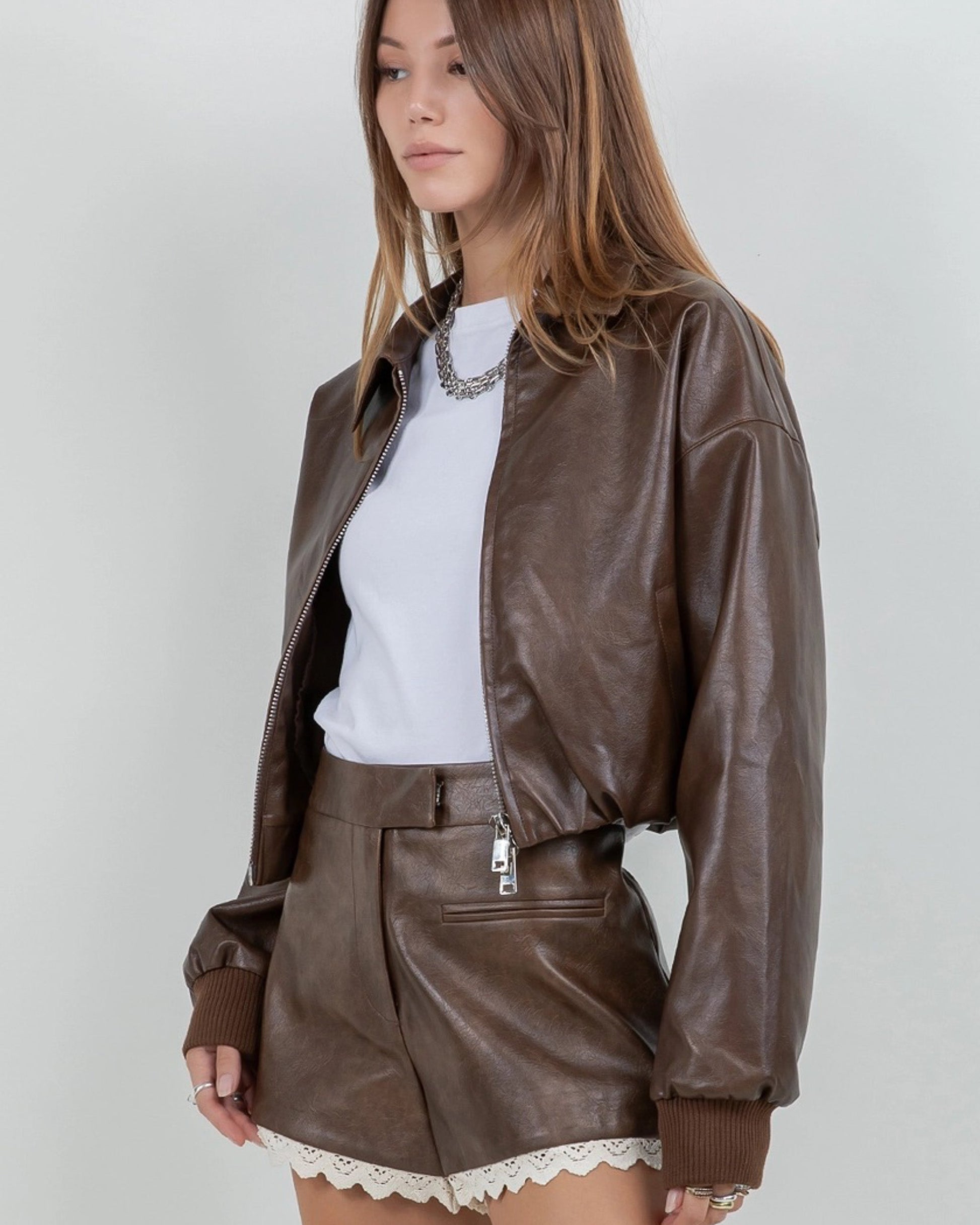 This cropped leather jacket blends structure with softness. The faux leather adds a touch of contrast, while the zip-up front and bubble hem silhouette keep it easy and flattering.