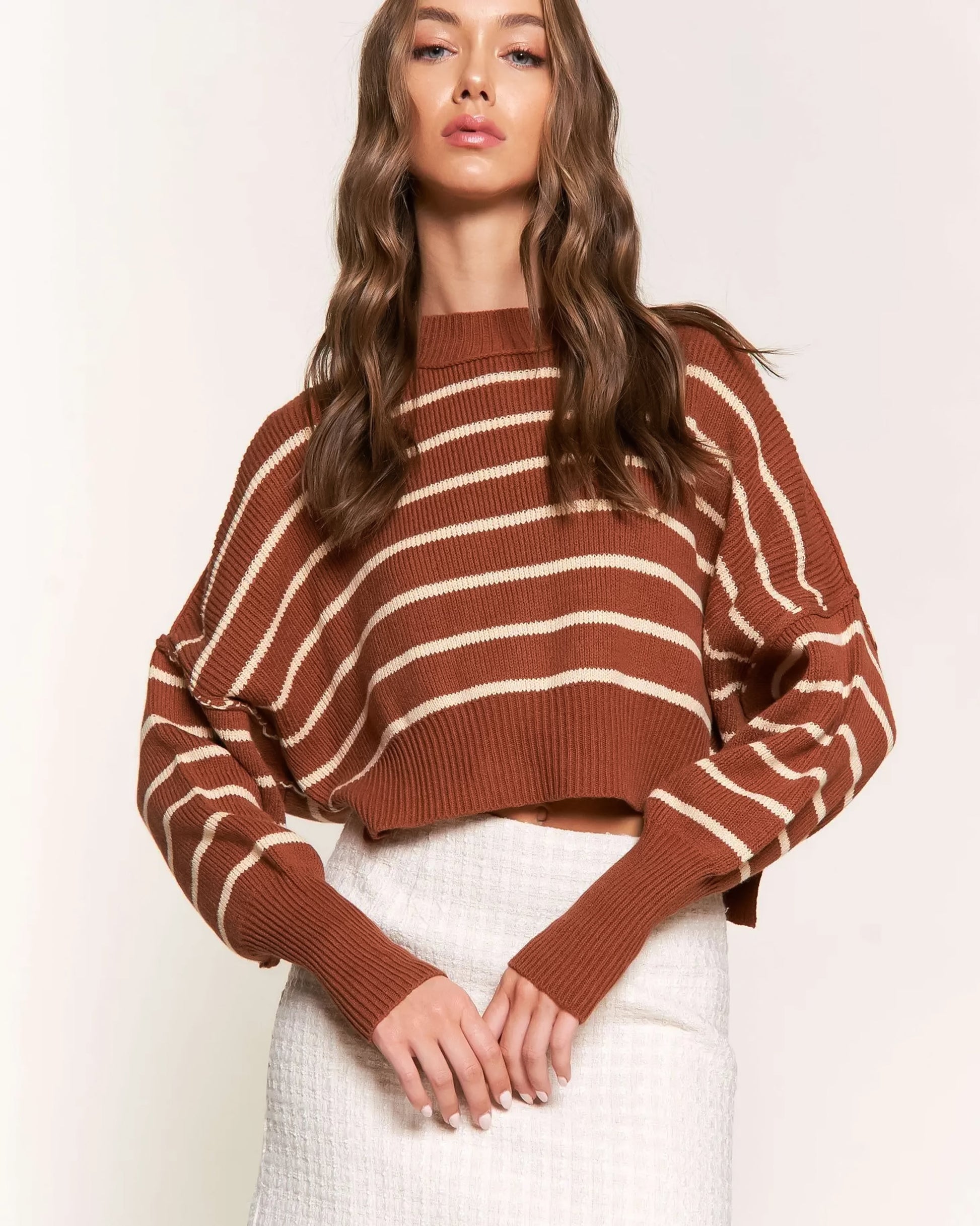 Features: Soft ribbed knit fabric, dropped shoulders, mock neckline, cream stripes.