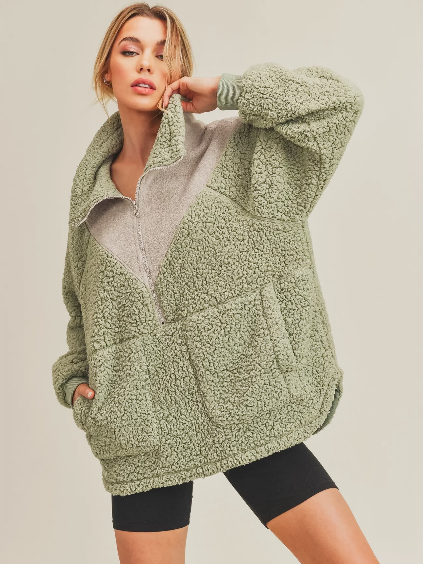 Features: Half zip neckline with grey suede accents and functional front pockets. Lightweight warmth on its own with room to layer underneath.