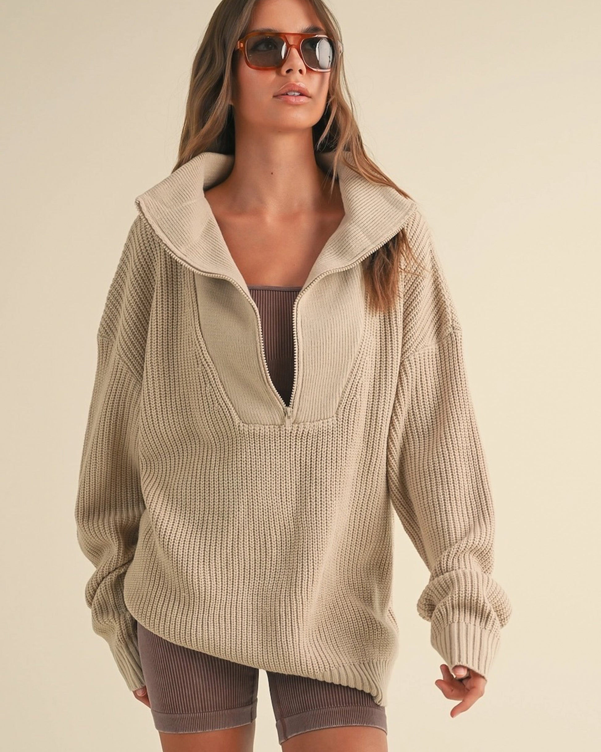 Crafted from chunky knit fabric, this tan sweater is slouchy and seriously cozy. The versatile half zip design allows you to adjust the collar for extra warmth, while its relaxed fit gives it a lived-in feel.