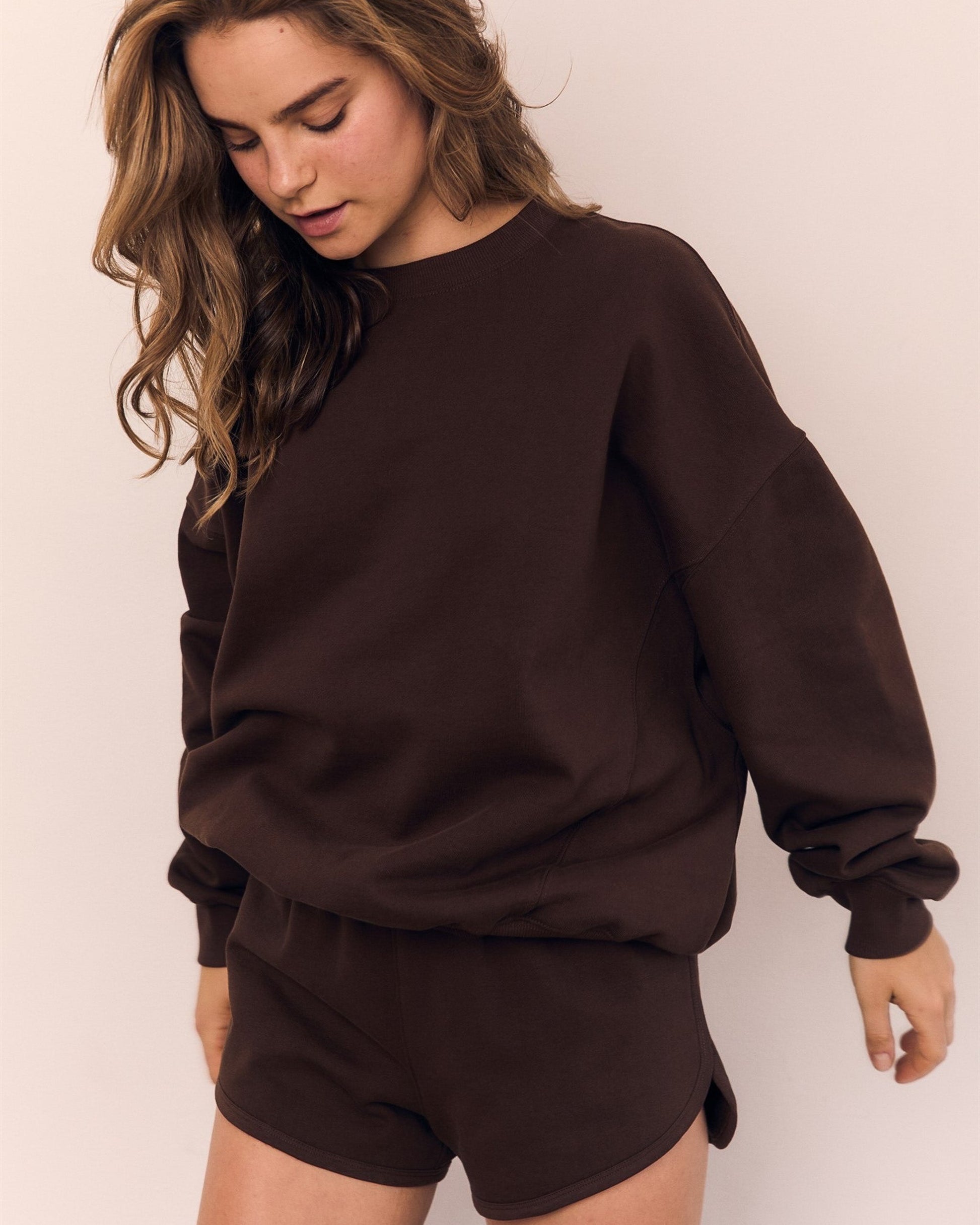 This french terry crewneck has that perfectly slouchy, lived-in vibe. Soft cotton fleece fabrication, oversized fit, and an easy throw-on-and-go vibe that works for errands, lounging, or throwing on after a workout. Pair it with jeans, leggings or the matching shorts and suddenly "lounging" feels like an outfit.