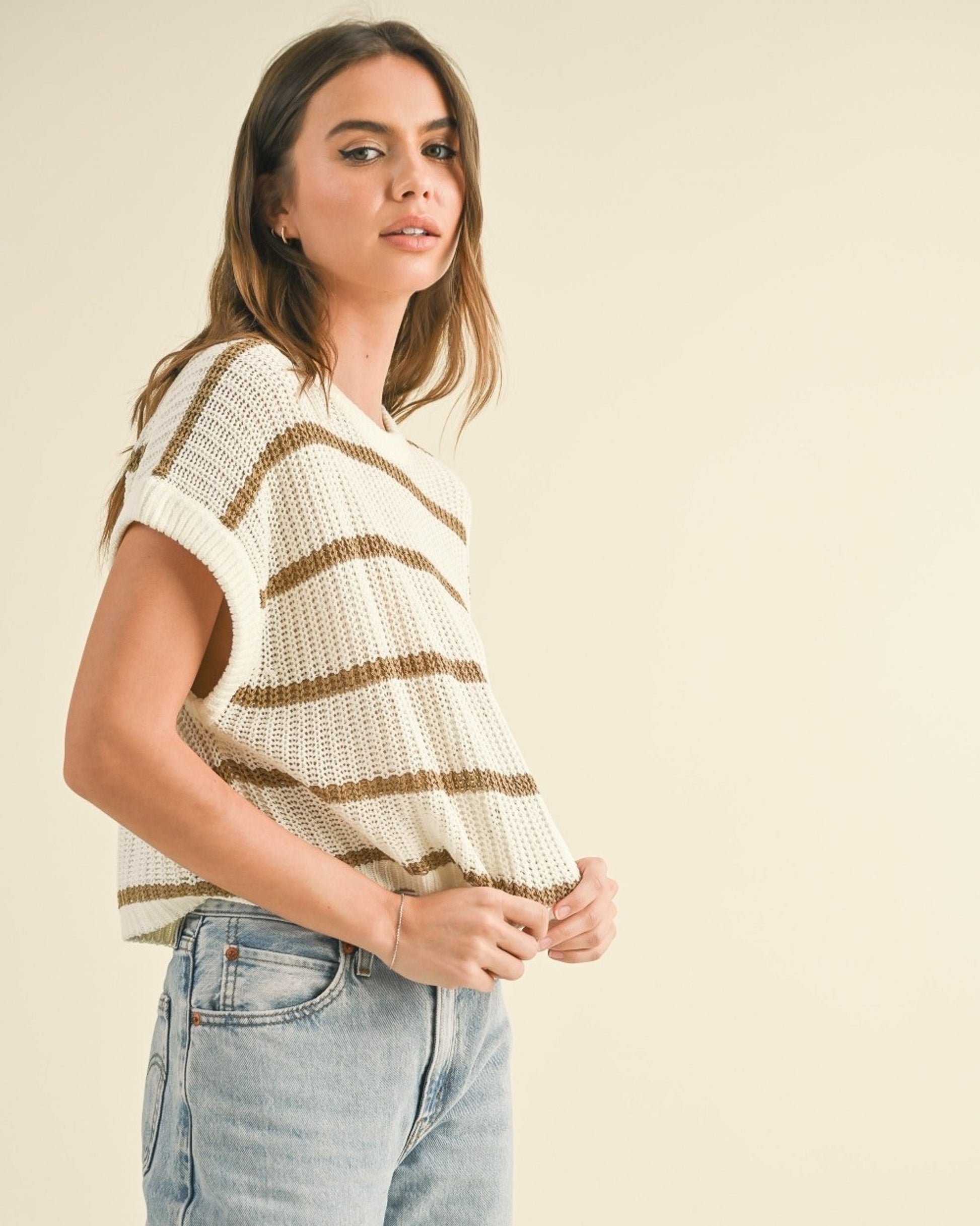 This short sleeve knit sweater is lightweight, soft, and slouchy in all the right ways- aka the definition of throw-on-and-go. The dolman sleeves drape with an easy, relaxed fit, while the tan stripes keep it timeless and endlessly wearable.