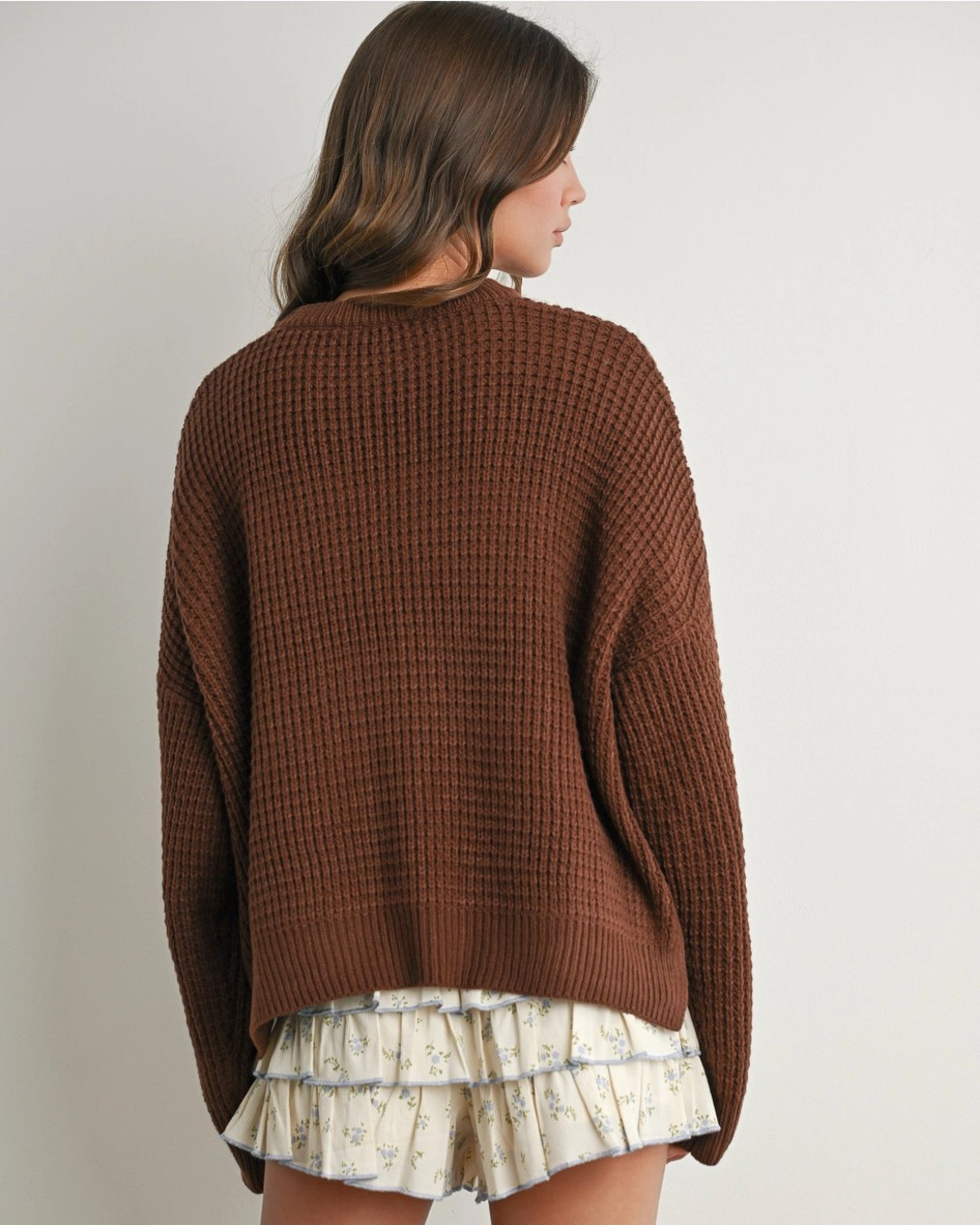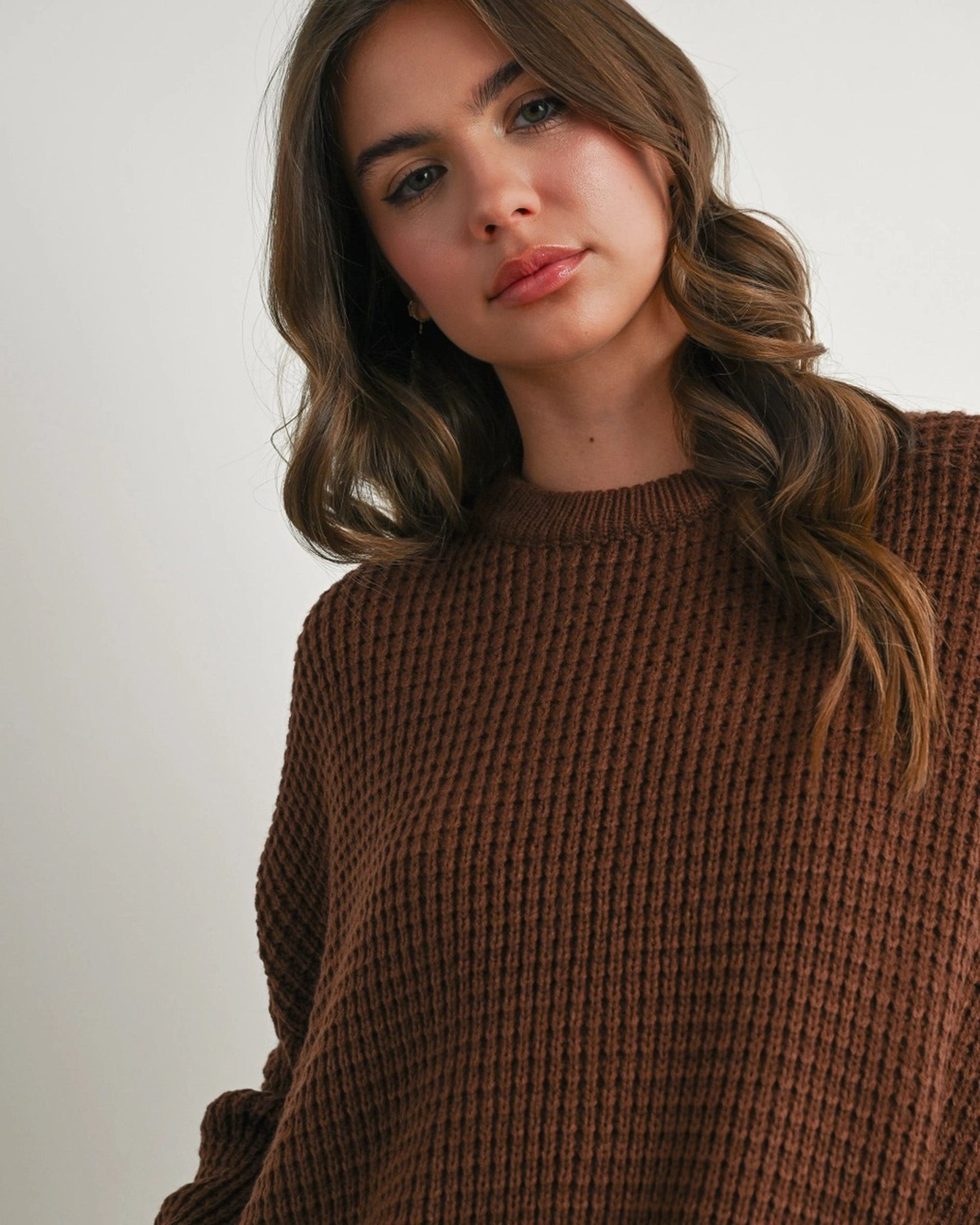 Our waffle-knit oversized sweater blends that soft, sink-into-it texture with an easy round neckline and a side slit hem. It's cozy without being bulky, timeless, and made for all things winter.