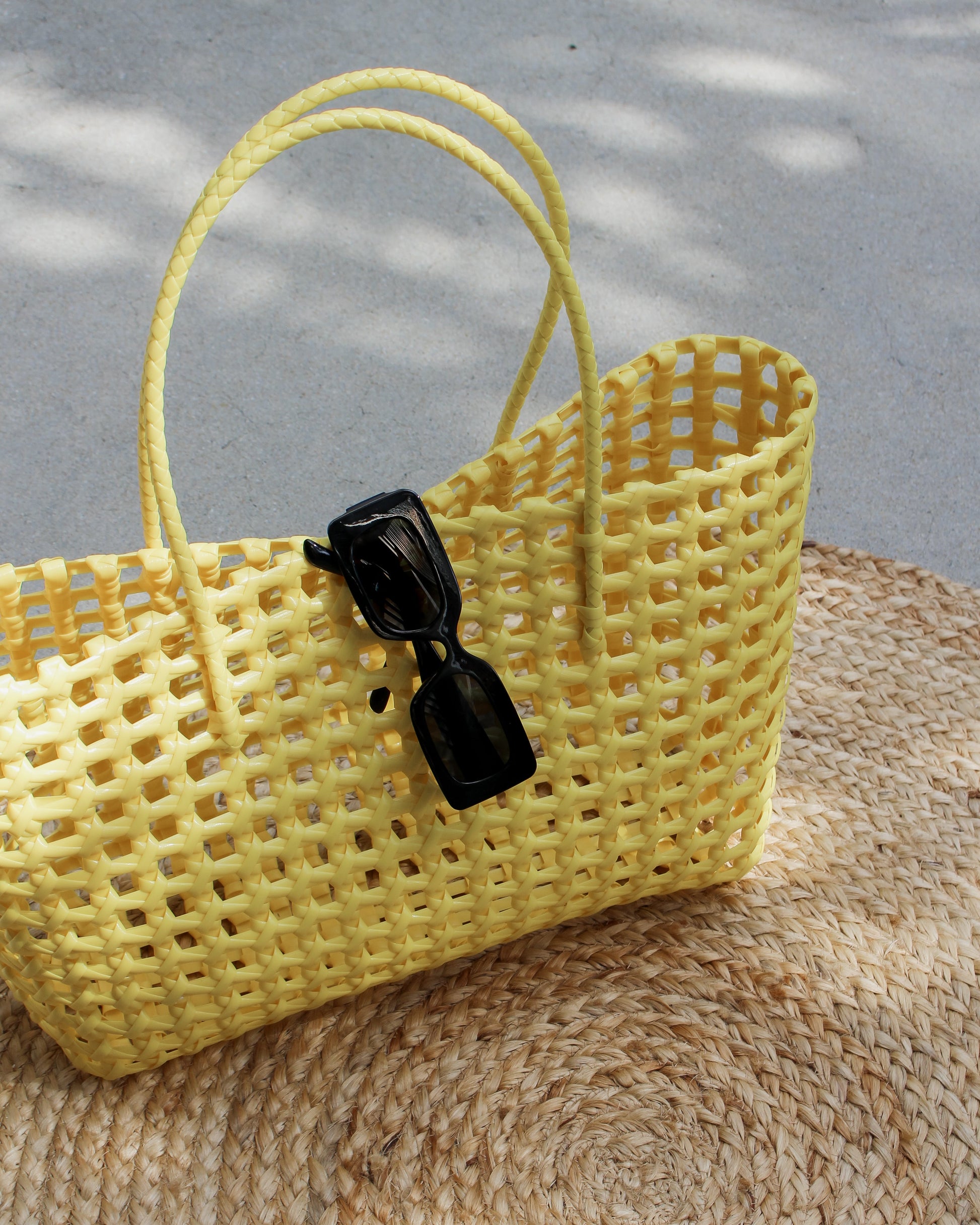 Woven with durable, lightweight plastic, this tote is designed to become your favorite everyday accessory. Spacious enough for all your essentials, it's the perfect companion for lazy beach days, conquering your gym routine, or setting up your mobile office at your favorite coffee shop.